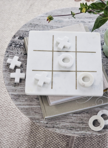 Spillet inneholder et spillbrett, 4 O-brikker og 5 X-brikker.